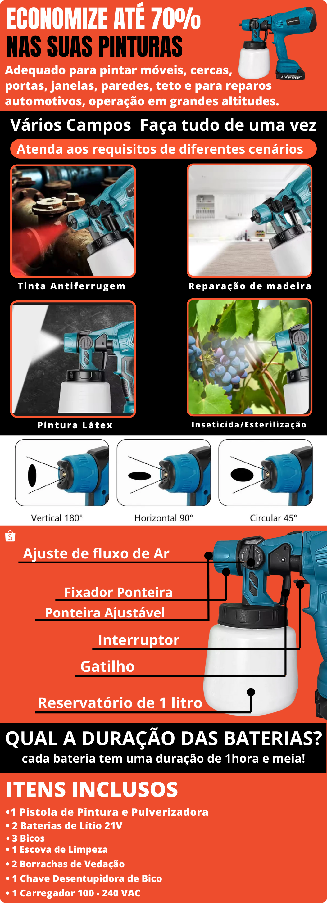 Pistola De Pintura Recarregável 2 Baterias 3 Bicos Profissional Pulverizador De Tinta 1000ml 200W